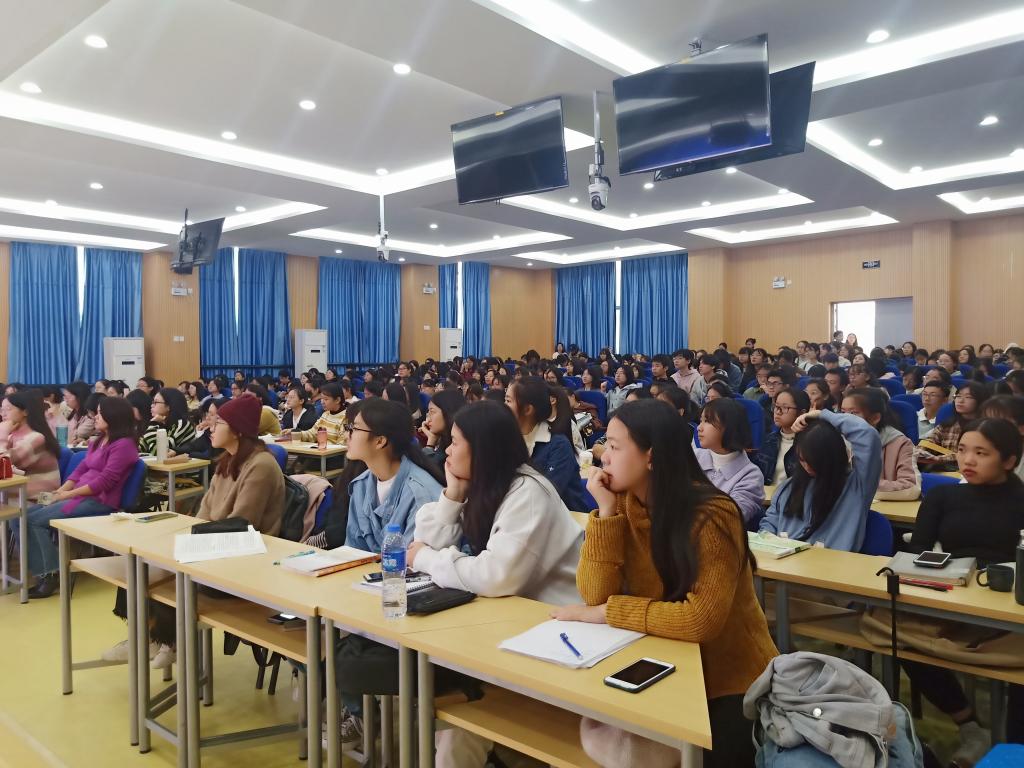 首先,朱老师解读了《福建省教育厅关于做好普通高中(2018级)课程实施有关工作的通知》,介绍了新高考模式下的“选课走班”和“等级赋分”的具体措施,根据最新统计数据表明,在新高考模式下生物课程的选修率在全国各省均占据前三,鼓舞了生物师范生们对于未来就业的士气。然后介绍了2017年版高中生物学课程标准提出的“核心素养为宗旨、内容聚焦大概念、教学过程重实践、学业评价促发展”等课程基本理念。最后以人教版高中生物必修3“种群的特征”为例概述深度学习中“体验式”学习,从教材分析、教学设计、教学评价等方面,具体介绍如何实现“生命观念、科学思维、科学探究、社会责任”生物学核心素养的培养。此次讲座引起学生们的强烈共鸣,现场不断响起阵阵掌声。