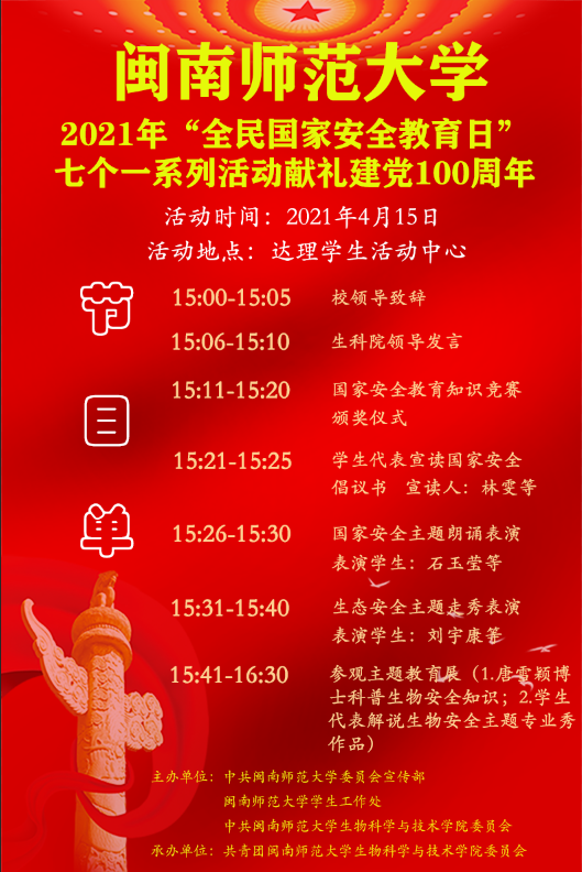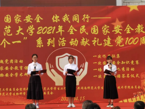 本次活动由3044永利集团党委副书记陈文婷主持,活动内容含校领导致辞、生科院领导发言、国家安全知识竞赛颁奖仪式、主题朗诵和环保走秀表演、主题承诺签名仪式和国家安全主题专业秀展览等。