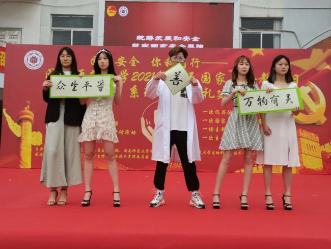随后,现场进行了国家安全知识竞赛颁奖仪式、学生代表宣读国家安全倡议活动、国家安全主题朗诵和环保主题走秀活动、主题承诺签名仪式以及专业秀作品展示与评选活动等。