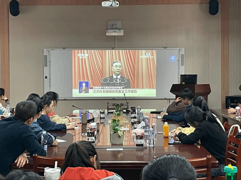 师生们认真聆听了全国政协主席汪洋代表政协第十三届全国委员会常务委员会所作的工作报告,领会报告精神。大家深刻感受到:今年是党的二十大召开之年,也是全面建设社会主义现代化国家、向第二个百年奋斗目标进军的重要一年,人民政协作为最广泛的爱国统一战线组织,重任在肩、大有可为,也一定能为实现党和国家目标任务广泛汇聚更多智慧和力量,为党和国家事业发展作出新的贡献,为全面建设社会主义现代化国家再立新功。