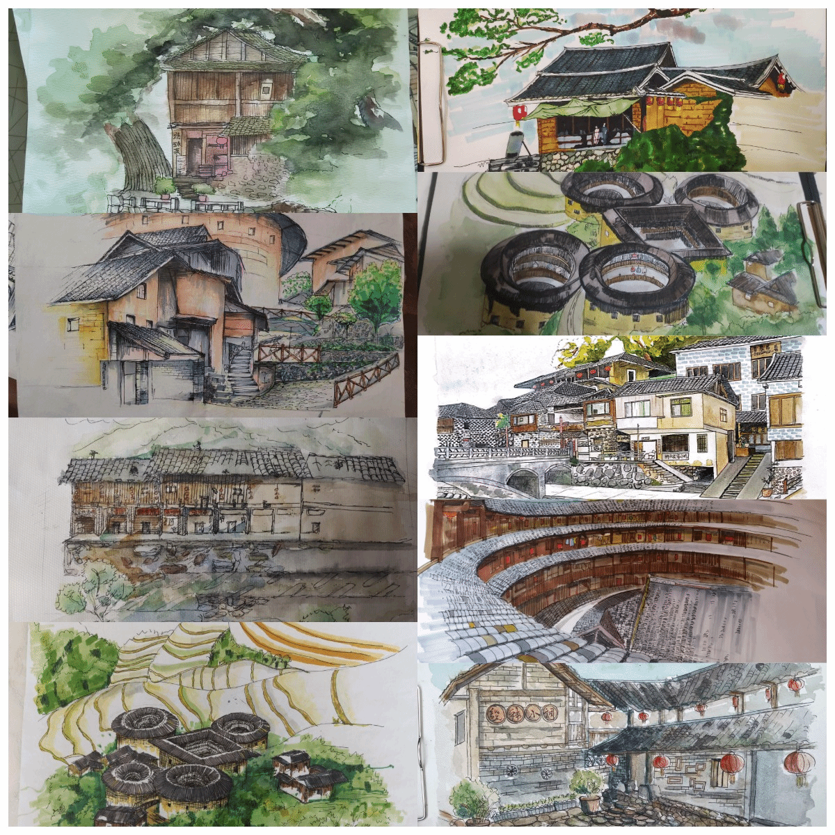 经过本次实践,我们也能清楚意识到传统建筑的新功能需要时间培育,旧村落的发展也需要时间,文化保护更需要持续的时间不断弘扬。如何保护好、传承好土楼及其土楼村庄适应现代化建设和土楼文化的传承,让大山里的土楼村落可持续发展是福建土楼地区人民和我们这一代应学习发展的重大课题。要结合现代人的生活需求与生活便利,改造、设计新式土楼。将大家庭的环境与小家庭的私密性更好更有机地结合起来,满足现代人的需求,传承祖先的智慧。每当步入每一栋土楼之中,体味不同的土楼建筑风采与土楼所处之地的地势起伏与山清水秀,同学们情不自禁的用手中画笔一笔一划勾勒出田螺坑土楼群的不凡之势。
