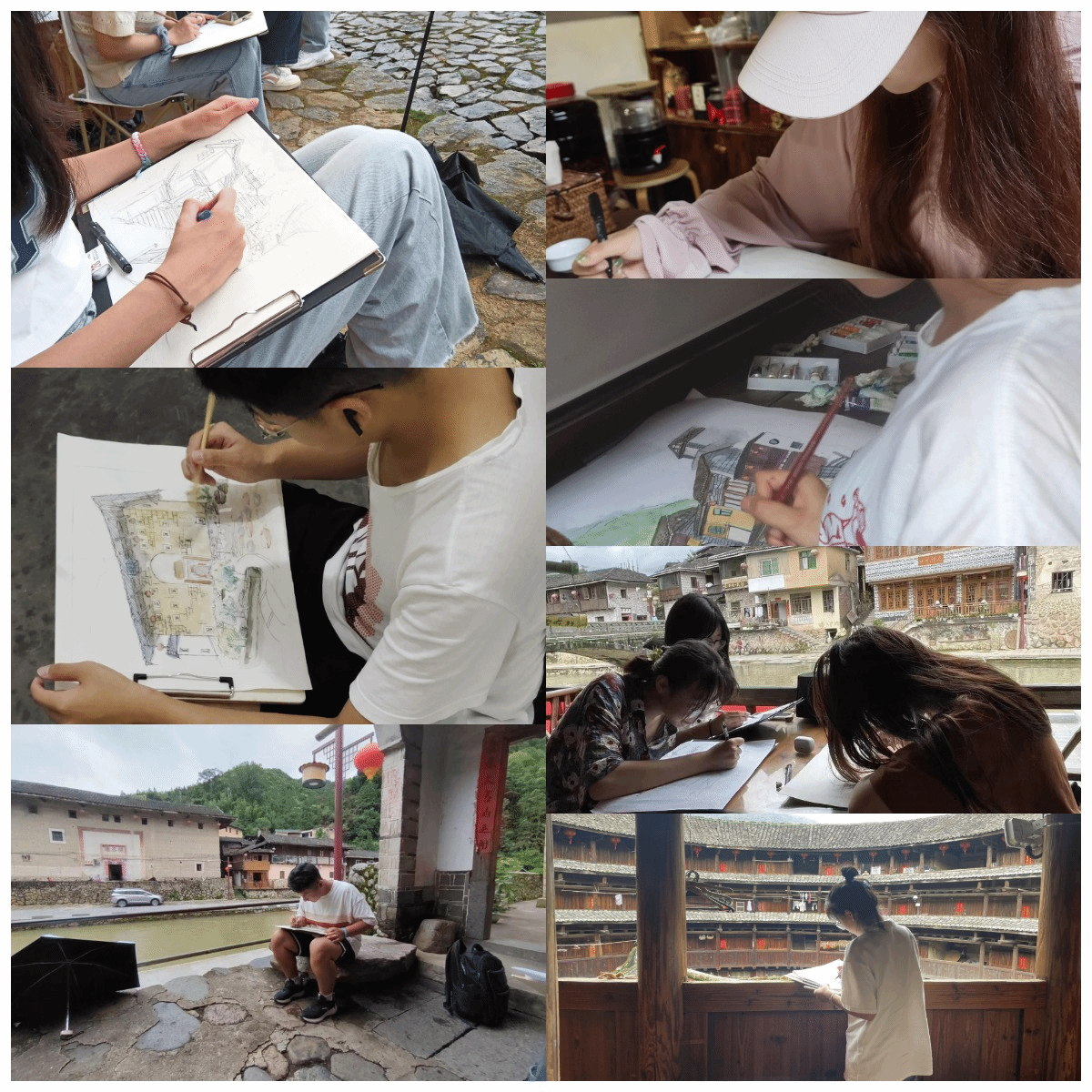 在此站点主要的实践内容包括:跟随导游在景区了解历史文化,寻找视角写生,观察不同建筑体的不同突出特点,走近村民家中了解当地风土民情等,并对云水谣较有世遗特色的土楼建筑进行艺术鉴赏和美学品鉴。
