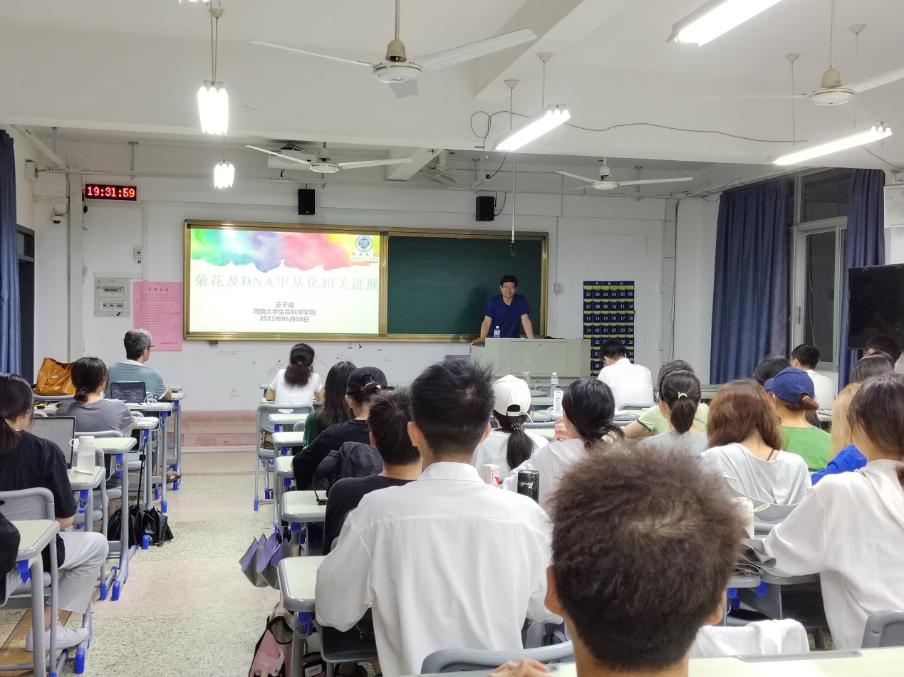 2023年6月8日,应3044永利集团邀请,河南大学王子成教授在我校北江滨校区博西201智慧教室作了题为“DNA甲基化调控菊花花期研究进展”的专题学术报告。报告由生科院副院长张国广教授主持,学院部分教师和园艺、生物科学和学科教学(生物)等专业学生共计60余人参加。