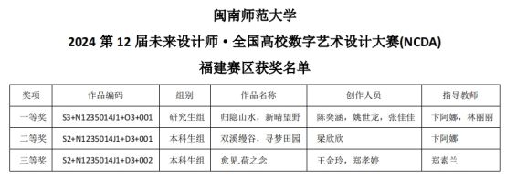 2024年第12届未来设计师·全国高校数字艺术设计大赛(NCDA)传来喜讯,我院师生以卓越的专业技能和创新精神再创佳绩。其中,陈奕涵、姚世龙、张佳佳同学的作品《归隐山水,新晴望野》(指导老师:卞阿娜、林丽丽)获研究生组一等奖;梁欣欣同学的作品《双溪缦谷,寻梦田园》(指导老师:卞阿娜)获本科生组二等奖;王金玲,郑孝婷同学的作品《愈见.荷之念》(指导老师:郑素兰)获本科生组三等奖。