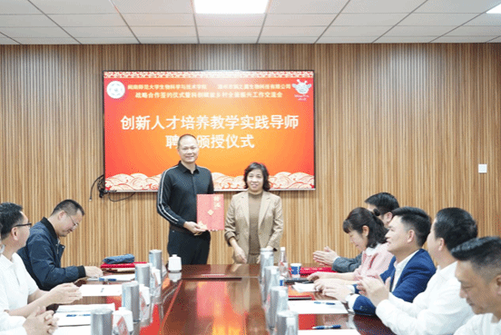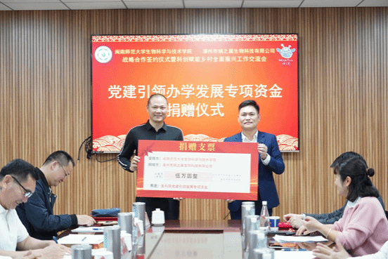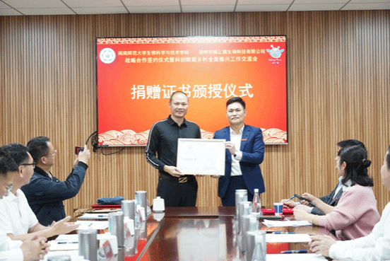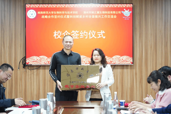 会议伊始,由漳州市娲之翼生物科技有限公司董事长许子超简要介绍了基地建设和企业发展情况,并在会议上举行了校企签约仪式、校企合作共建教学实践基地授牌仪式、创新人才培养教学实践导师聘书颁授仪式、党建引领办学发展专项资金捐赠仪式和捐赠证书颁授仪式。