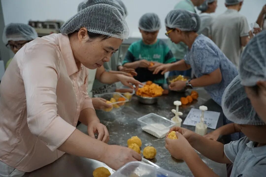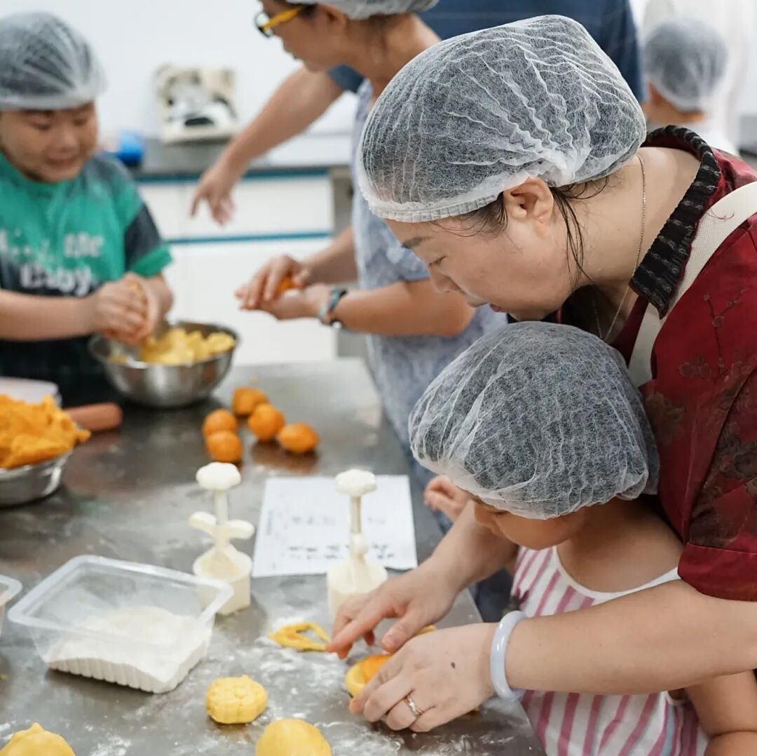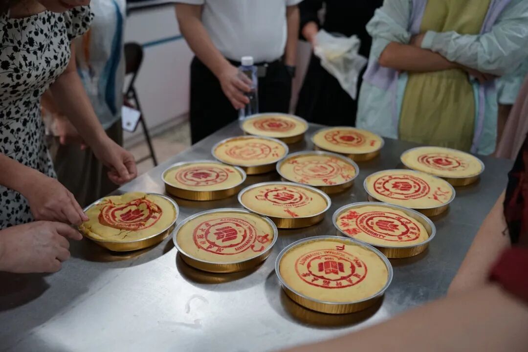 活动现场物料齐备、工具井然。老师们戴上食品工作帽,化身 “糕点师”,称重、揉面、擀皮、包馅、压模,一气呵成,印有“永利集团3044”字样的月饼胚整齐排列,送入烤箱,不一会儿,浓郁的月饼香气便弥漫在整个活动现场。