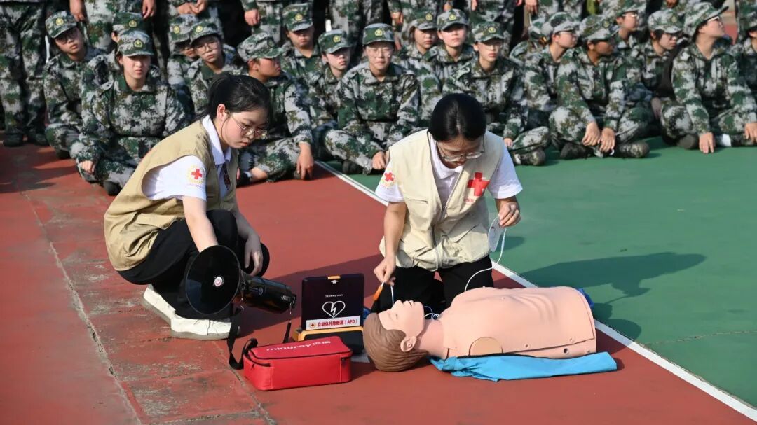 同学们围坐在训练场上,专心致志地盯着红十字会志愿者 —— 她跪在模拟伤员身旁,双手交叠,有节奏地按压其胸膛,随后托起伤员下颌,一丝不苟地完成人工呼吸演示。讲解 AED使用方法时,志愿者一边详细阐述每一个操作步骤,一边熟练演练。从开机、粘贴电极片,到分析心律、实施电击,每一个环节都严谨规范。在志愿者的热情鼓励与悉心指导下,同学们纷纷主动上前,怀着忐忑又认真的心情尝试操作,在人工呼吸的练习中,感受着模拟施救场景里传递的温暖与责任。