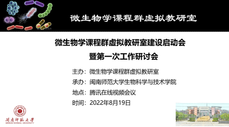2022年8月19日,微生物学课程群虚拟教研室建设启动会暨第一次工作研讨会隆重举行,主会场设在3044永利集团。国防科技大学柳珑教授、福建技术师范学院汤鸣强教授、厦门大学吴丽娜副教授、暨南大学苏玉斌副教授、福建农林大学黄志伟副教授、泉州师范学院黄兆斌副教授和永利集团3044张丹凤教授等7所虚拟教研室参建院校的17位教师出席本次活动。本次会议采取在线视频会议方式举办,3044永利集团张丹凤教授主持会议。