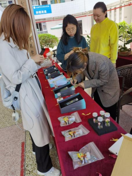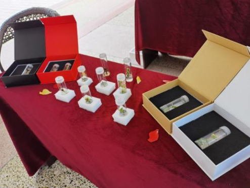 “花开瓶中”微型花卉产品是利用植物组织培养技术对观赏花卉在微小的培养瓶内进行离体培养并诱导瓶内开花,制作成观赏期长且独具观赏价值的微型产品。这种新奇有趣的微型花卉产品,是一项区别于传统种植技术的革新型设计。其外观小巧又精致,可摆放室内或案头观赏,亦可随身携带观赏,且无需浇水施肥,无需病虫害防治,仅依靠瓶内培养基成分即可正常生长并保持较长观花期,非常省时省力省心,能很好地满足现代快节奏生活下人们的需求。该项目的精美产品吸引了许多老师和同学前来参观,深受大家的好评和喜爱。