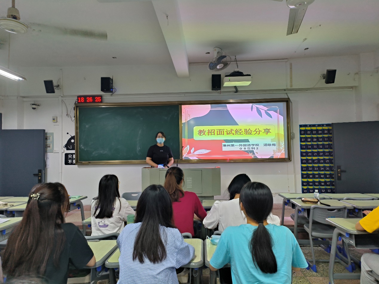 汤咏梅老师从教师招考的仪容仪表、面试流程、面试准备到评委提问等进行详细介绍,并深入剖析“片段教学”的内容和结构,详细阐述了片段教学的要点,尤其是针对不同片段类型选择不同的小技巧、板书设计技巧等赢得同学们阵阵掌声。最后请20生科3班在漳州市第一外国语学校实习的实习生黄浩斌进行片段教学展示,并点评。