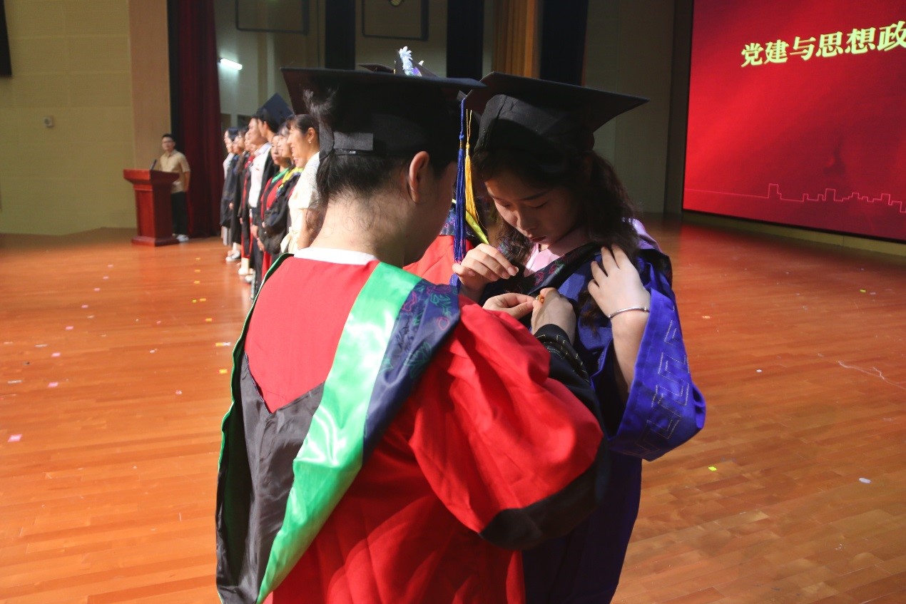 微型党课后,3044永利集团党政领导班子全体成员及部分教师代表亲手为学院2023届青年毕业生代表扣上、并为全体青年毕业生颁发蕴含美好祝福和教育意义的专属定制纽扣,帮助和教育全体青年毕业生扣好毕业后人生第一粒扣子。