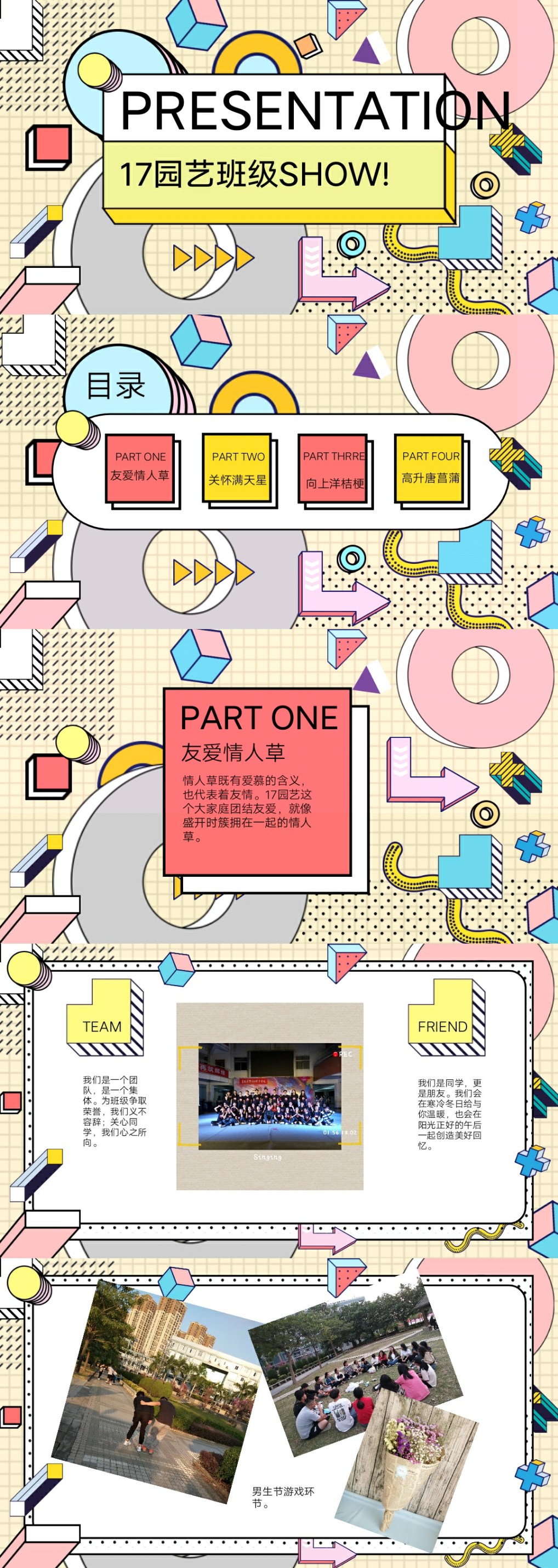 17园林一班:他们以班级风采展示,班级活动展示,班级合作成果展示,班级学习成果展示多方面进行介绍,让我们看到一个具有温情、团结和谐的班集体。
