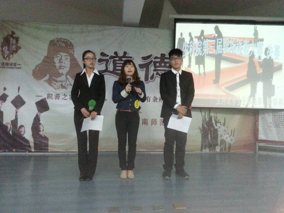 生科院第三届职场逐鹿大赛决赛在达理活动中心三楼多功能厅隆重举行,活动由生科院学生会主办,生科院学生会职拓部、外联部联合协办。参赛人员包括大一至大四的学生,众多亲友团参与现场,活动还邀请了兴业银行姚老板、千之航涮涮锅徐老板、新食尚陈老板以及经济学院学生干部、校创业服务中心学生干部、辅导员廖小文老师等九位评委作为评审团。