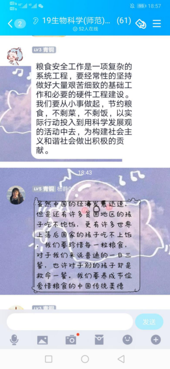 生科院各团支部开展形式多样的宣传活动。18生科1班团支部充分利用互联网优势,以班Q、班级微博等形式,进行特色光盘随手拍打卡、节约粮食小知识宣传等活动,深刻领会世界粮食日的真谛。19食安团支部开展问卷调查,了解平日里同学们浪费粮食的情况及原因,让同学们意识到自己是否日常中存在浪费粮食的行为,日后将有意识地减少或杜绝这种浪费粮食行为,尽量做到“爱粮节粮”。