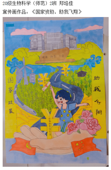 生科院学子通过宣传画、征文、海报、剪纸等方式积极参与,围绕十八大以来学生资助取得的成就,讲述真实故事,记述成就举措,体现学生健康成长、顺利求学、圆梦成才的成长历程,彰显受助学生心怀感恩、励志奋斗、勇担使命的精神面貌。