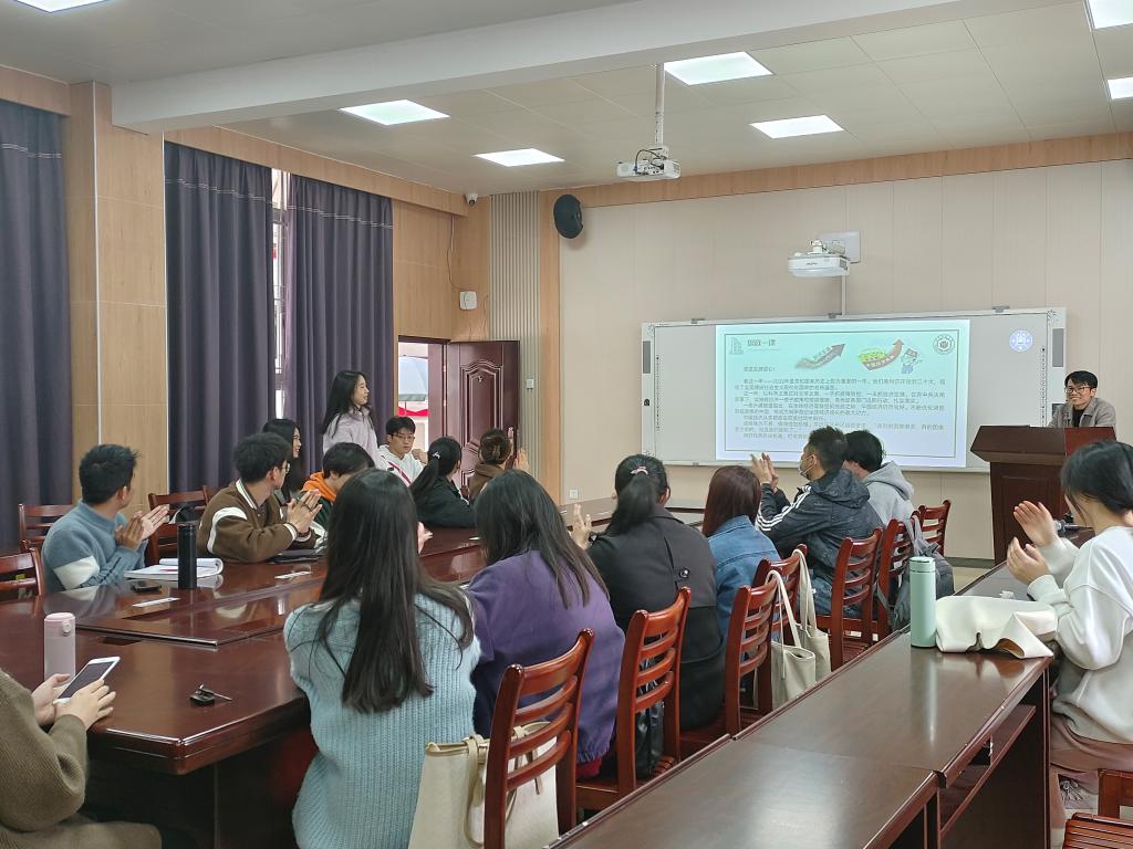 辅导员廖老师在给学院研究生召开“开学第一课”主题班会中,重点从思想政治教育、安全教育、学风建设、就业成长教育等方面与研究生同学们进行了互动交流,重点强调研究生要注重防骗、树立纪律意识,做好就业规划。廖老师指出,态度决定一切,同学们要以自信、乐观和积极的态度面对学习和生活,合理安排时间,努力实现目标,为大家注入了一针强心剂。