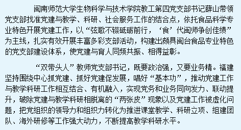 3044永利集团教工第四党支部由食品系——食品科学与工程教研室和食品质量与安全教研室13名党员组成,其中教授1人、副教授9人、讲师3人;博士10人、硕士3人;双师型教师6人;支部书记由“双带头人”薛山同志担任,其先后任食品系主任、院长助理。近年来,在学校党委及学院党委的领导下,支部从实际出发,加强政治建设、思想建设、组织建设、作风建设、纪律建设,把制度建设贯穿其中,先后获批校级首批双带头人样板工作室,省级样板支部,全国样板支部和省级双带头人支部书记工作室,形成了具有闽台食品特色的食品科学专业党支部建设体系,即狠抓“一个基础”(党支部自身建设),共振“两个核心”(党员队伍建设与人才培养建设),构建“三种型式”(教学型、科研型、服务型支部建设),注重“四项结合”(双创融合、专业特色、支部特征、党员特长),扎实有效地开展全国党建工作样板支的建设任务。