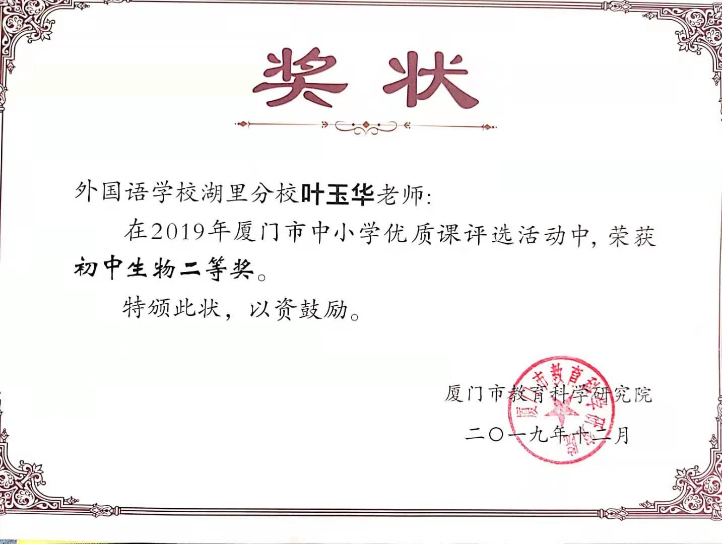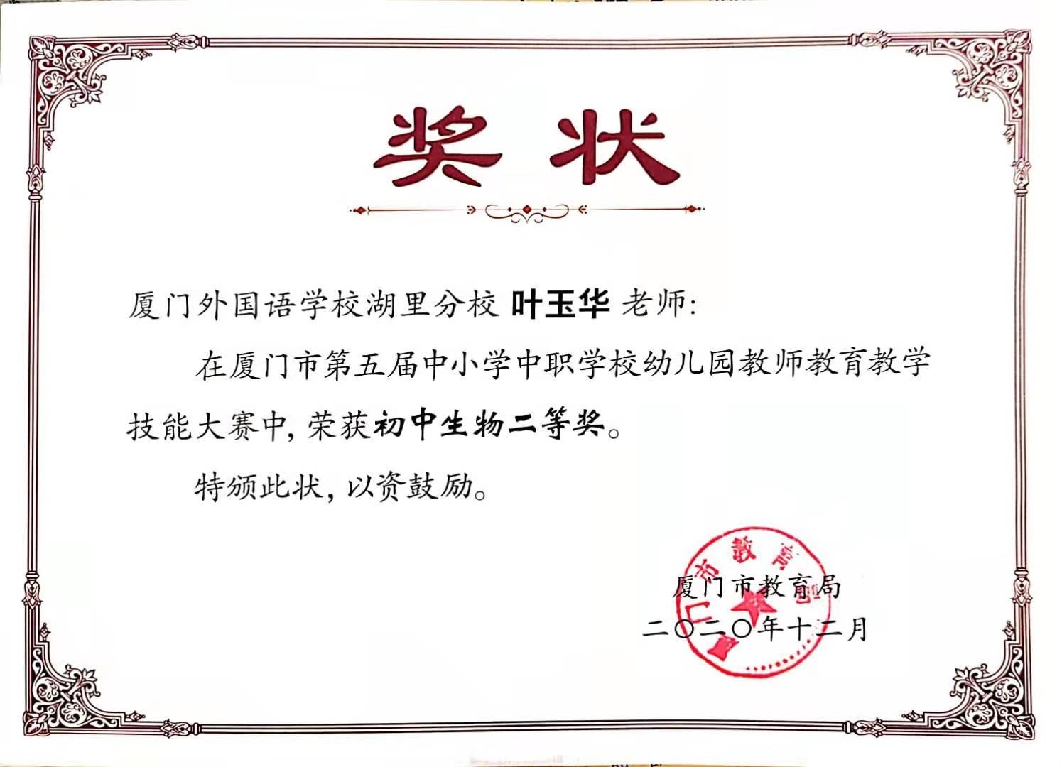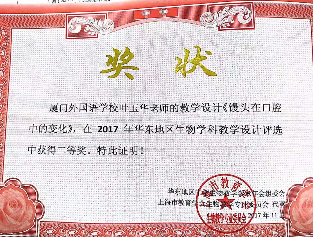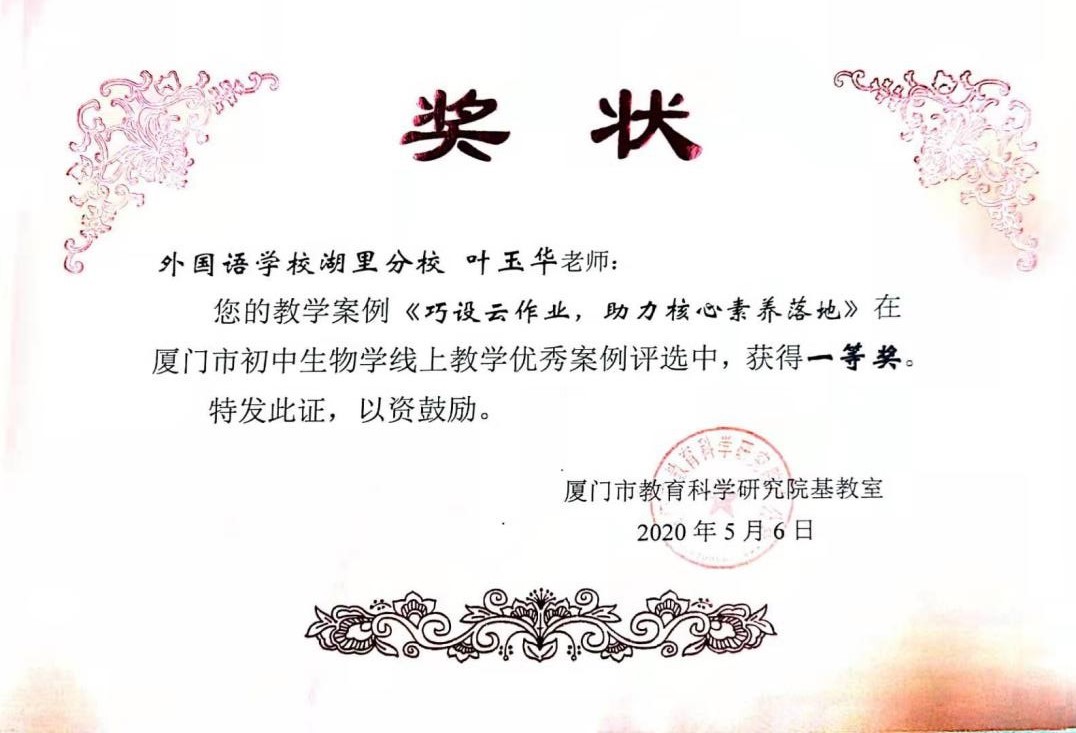 学姐目前就职于厦门外国语学校湖里分校,任2019级的级段长。在职期间,她获得过厦门市湖里区优秀教师、优秀班主任等荣誉称号;担任班主任期间,所带班级被评选为厦门市优秀少先中队、湖里区优秀团支部;在教学方面,荣获福建省复习微课二等奖,厦门市教师技能赛二等奖,厦门市优质课评比二等奖,等30余项奖项。